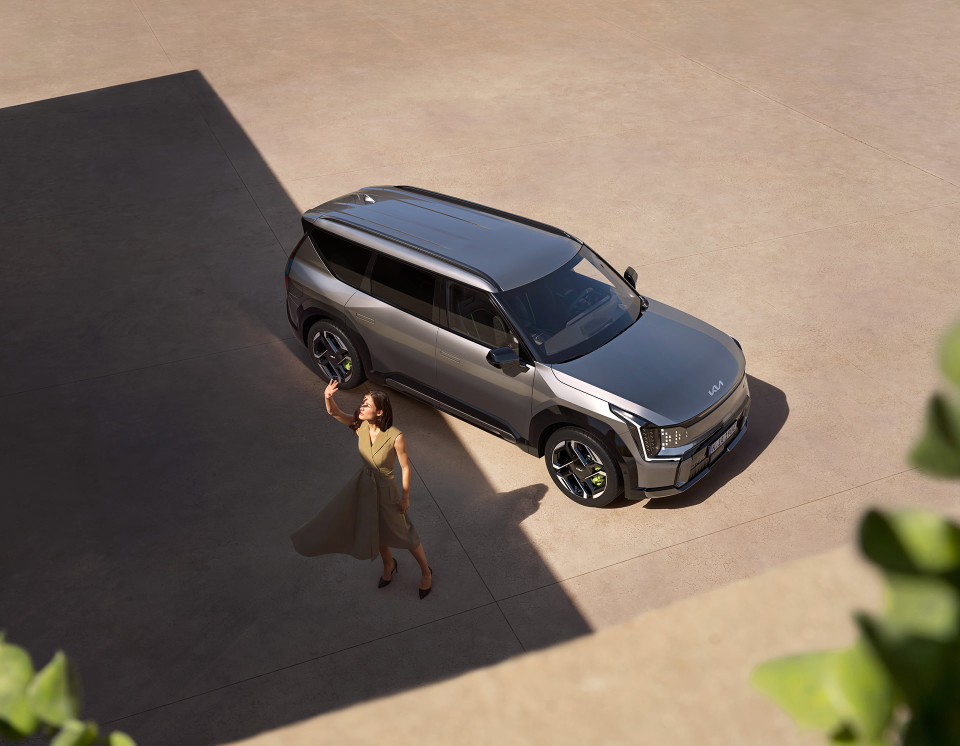 Der EV9 GT überzeugt aus jedem Blickwinkel: Schwarze Dachreling, glänzend schwarze Fensterleisten und Spiegelgehäuse betonen die dynamische Silhouette. Technisch geformte Seitenschweller und ein trapezförmiger Heckstoßfänger mit sportlichem Unterfahrschutz runden das Design ab.